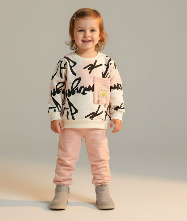 Kids Graffiti Print Winter Tracksuit | Warm Fleece Sweatshirt & Jogger Set | Yellow & Pink